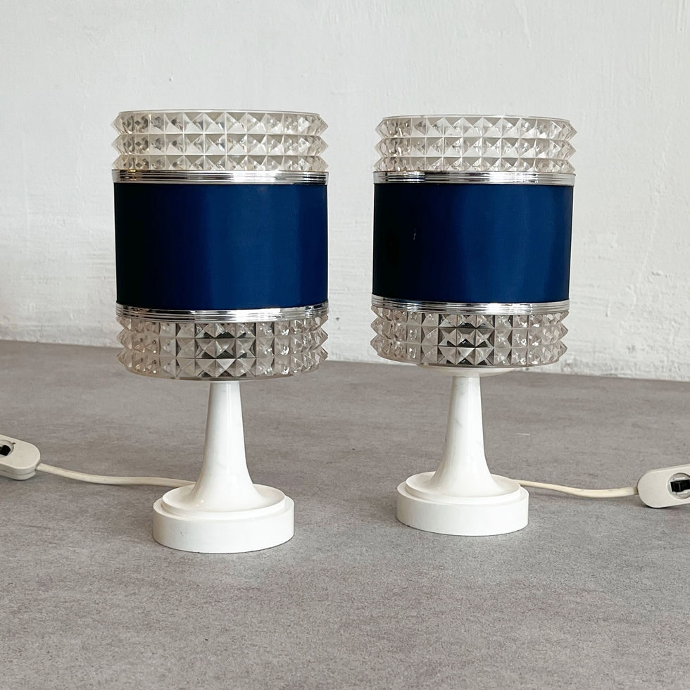 Each lamp features a distinctive tulip-shaped plastic base that provides a sleek and stable foundation, perfectly capturing the era’s fascination with organic forms and futuristic silhouettes. The base is complemented by a unique lampshade, crafted from a combination of plastic and blue satin. The interplay between the glossy plastic and the soft, luminous satin creates a striking visual contrast, adding both texture and sophistication to the design.