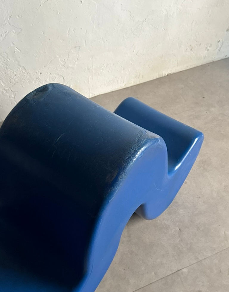 Original Blue Phantom chair/table in plastic including marks and stamps. Multiuse chair, bench or table designed by Verner Panton. By rotating the form you can change its function; high back lounge chair, deep seated lounge chair, two seated bench, or table. Lay flat or upright. The piece shows traces of use like scratches where it touches the floor.